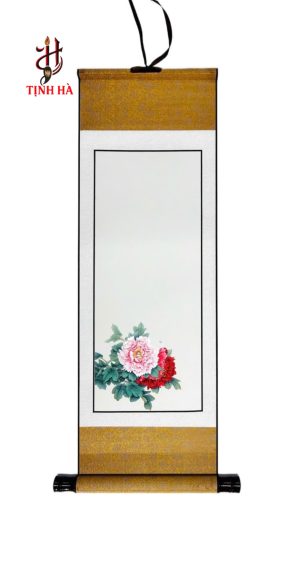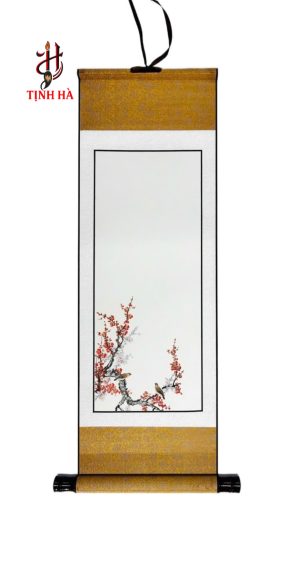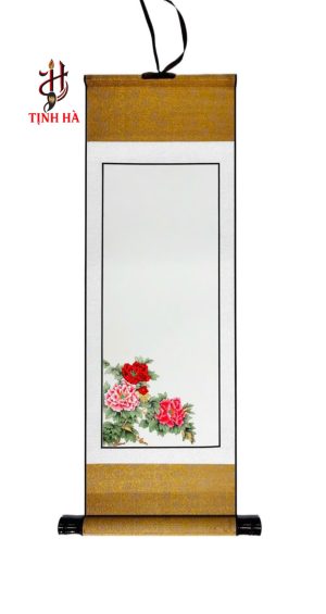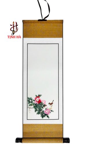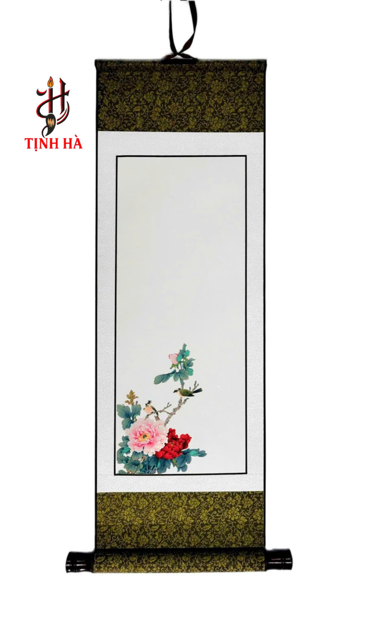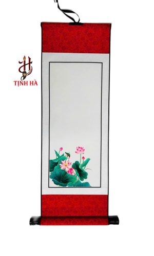 **Viền gấm và trục gỗ**: Viền gấm được may tỉ mỉ tạo đường viền sang trọng, còn trục gỗ giúp căng phẳng biểu lụa và thuận tiện cho việc treo trang trí.