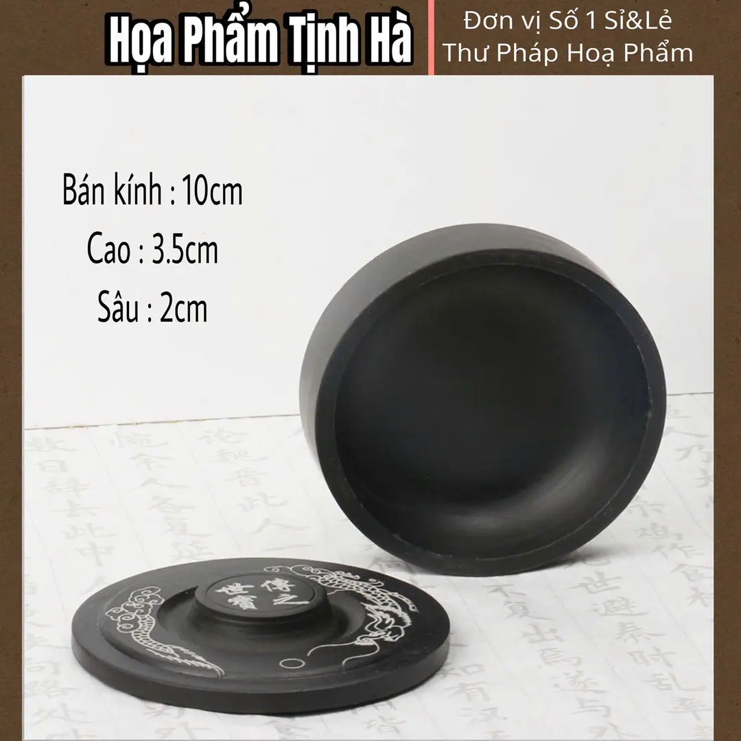 Kích thước đường kính 20cm tạo không gian mài mực rộng rãi và thoải mái. Chiều cao 3.5cm đảm bảo độ ổn định khi sử dụng lâu dài. Độ sâu lòng nghiên 2cm cho phép chứa lượng nước vừa đủ. Tỷ lệ này được tính toán dựa trên kinh nghiệm hàng trăm năm. Bề mặt mài được xử lý với độ nhẵn hoàn hảo. Không có các vết xước hay lỗ hổng làm ảnh hưởng chất lượng mực. Trọng lượng vừa phải giúp di chuyển dễ dàng khi cần thiết. Thiết kế nắp đậy vừa khít không để bụi bẩn xâm nhập. Họa tiết rồng nổi cao 2mm tạo hiệu ứng thị giác ấn tượng. Các chi tiết nhỏ được chế tác tỉ mỉ từ vảy đến râu rồng. Màu sắc đá tự nhiên tạo vẻ đẹp sang trọng và cổ điển. Theo nghiên cứu từ Viện Hán Nôm và Đại học Quốc gia Hà Nội về dụng cụ thư pháp truyền thống. Thư Pháp Họa Phẩm – Tịnh Hà đã áp dụng các tiêu chuẩn khắt khe nhất.